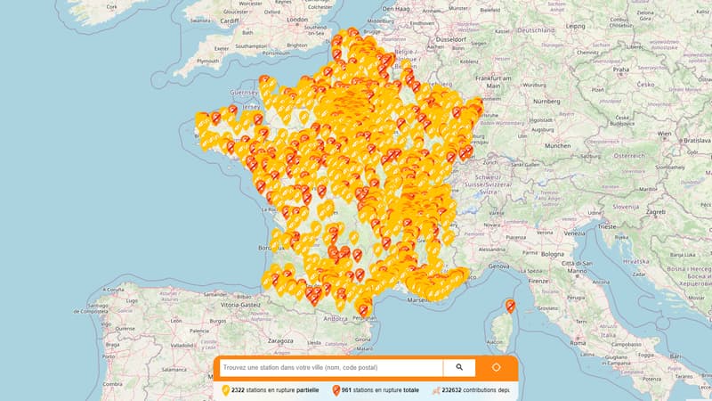 This Monday, November 14, the map of the “penurie.mon-essence.fr” site (Essence&Co application) thus showed 2,322 stations in partial breakdown (at least one fuel is missing) and 961 stations in total breakdown, that is, almost 30 % of stations in difficulty out of a total of approximately 11,000 in France. A situation that worsened significantly compared to last Thursday.