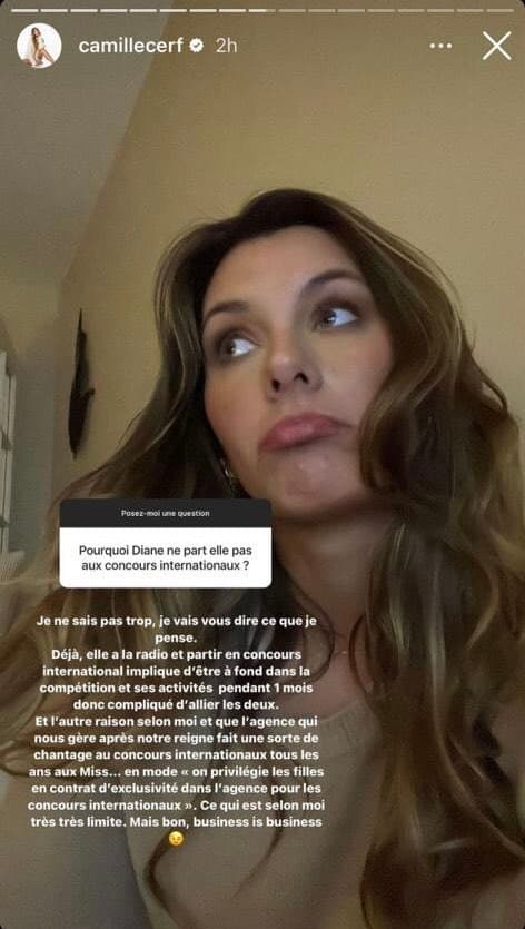 Guillaume Genton then asked her about an Instagram story posted by Camille Cerf earlier in the day on Tuesday. Miss France 2015 evoked in more direct terms the absence of Diane Leyre in future international competitions: