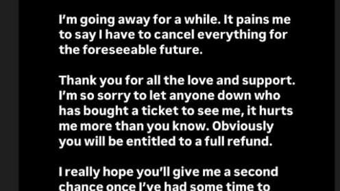 “It hurts to say that I have to cancel everything in the near future. I regret a lot to disappoint all who bought a ticket to see me, it hurts more than you think,” I’m just screwed up.
