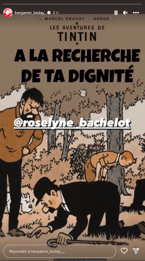 This is particularly the case with Benjamin Biolay, whom he describes as “an artist among the richest with a slice of bread well buttered and on both sides” in his book. The artist responded to him on his Instagram account with a parodied cover of a Tintin album entitled “In search of your dignity” and in which the Roselyne Bachelot account is identified.
