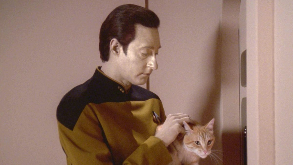 The cats who played Spot on Star Trek: The Next Generation it certainly earned its keep, as viewers would see them do things like repeatedly jump on Data’s desk and obnoxiously meow to eat or play. Conversely, all the puss in “Surrender” had to do was get caught up with Brent Spiner as the actor talked as Data about how Spot taught him to love, and then Lore held him. It’s a walk in the park for a cat to simply be petted and adored, as any feline owner will tell you.