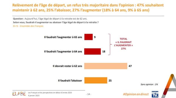 A decline that the French do not accept according to a new survey “L’Opinion en direct” conducted by the Elabe Institute for BFMTV. According to this new survey, only one in four French people (27%) believe that the retirement age should be raised. In detail, only 18% of those surveyed want it to be increased to 64 and 9% to 65.