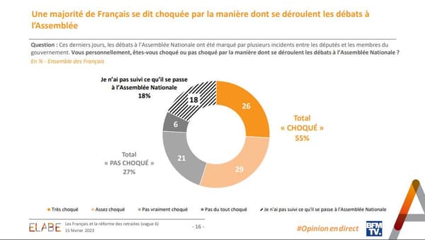 A tense climate that the majority of the French say they are shocked, according to a new survey “L’Opinion en direct” carried out by the Elabe Institute for BFMTV. In detail, 55% of those surveyed say they are impacted by the way the debates are carried out in the Assembly, including 29% quite impacted and 26% very impacted.