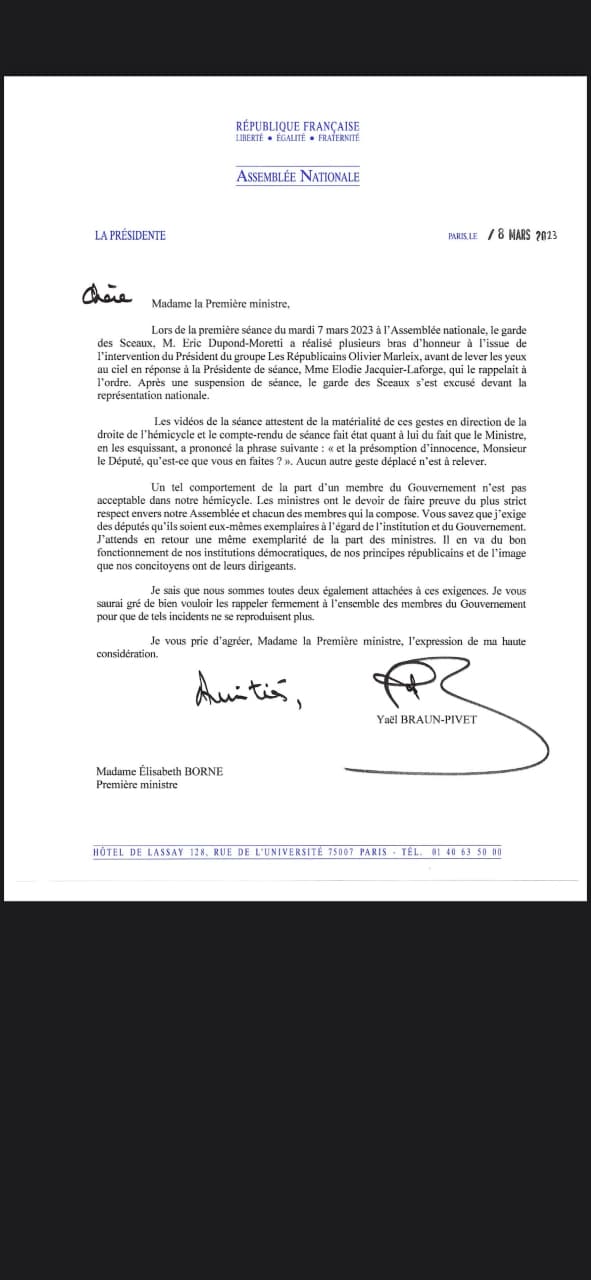 Referring to the actions of the Minister of Justice, Yaël Braun-Pivet criticizes in particular the “unacceptable behaviour”, and further concludes: “I would appreciate it if you would remind (these exemplary requirements, editor’s note) firmly to all members of the government so that this type of incident does not happen again.