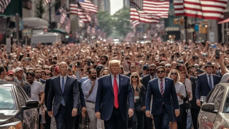 In a tweet that garnered more than 150,000 likes, former US President Donald Trump’s son Eric shared an image of his father walking with a crowd of supporters on an avenue lined with American flags in New York. Problem: This photo was taken by a generative AI, presumably Midjourney.