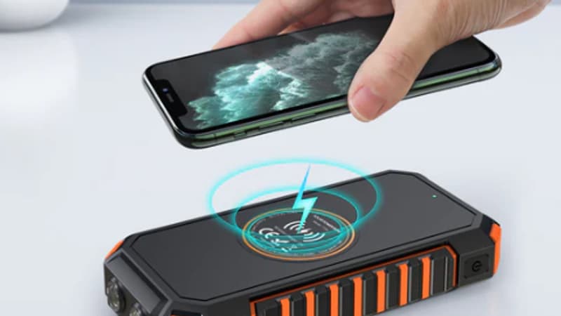 On the connector side, its three 15W USB outputs (two USB-A ports and one USB-C fast charging port) are capable of charging your phone to 50% in 30 minutes. The power bank can charge four devices at the same time. Waterproof and robust thanks to its reinforced shell, it also has a compact design and a moderate weight (470 g) for a model of this capacity. It also stands out for its two practical integrated LED lights for outdoor activities at dusk or at night.