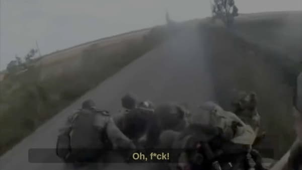 The first video first shows a crossroads, on a Ukrainian national highway. We hear the angry Russian soldiers near their tank.